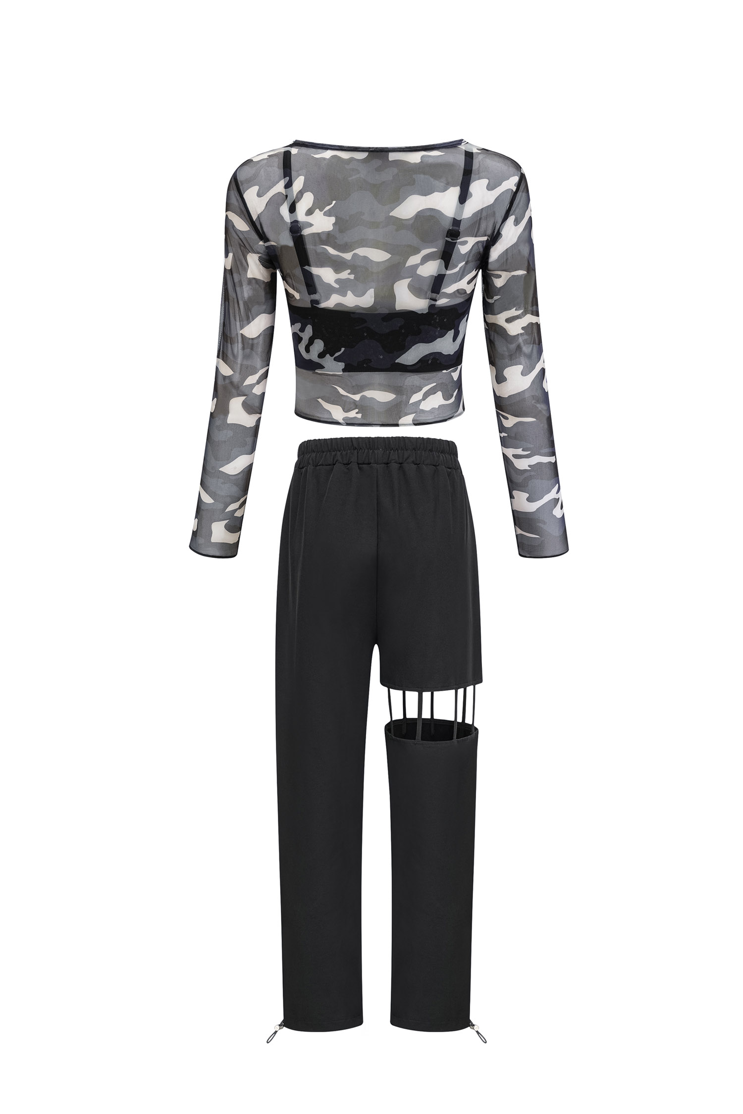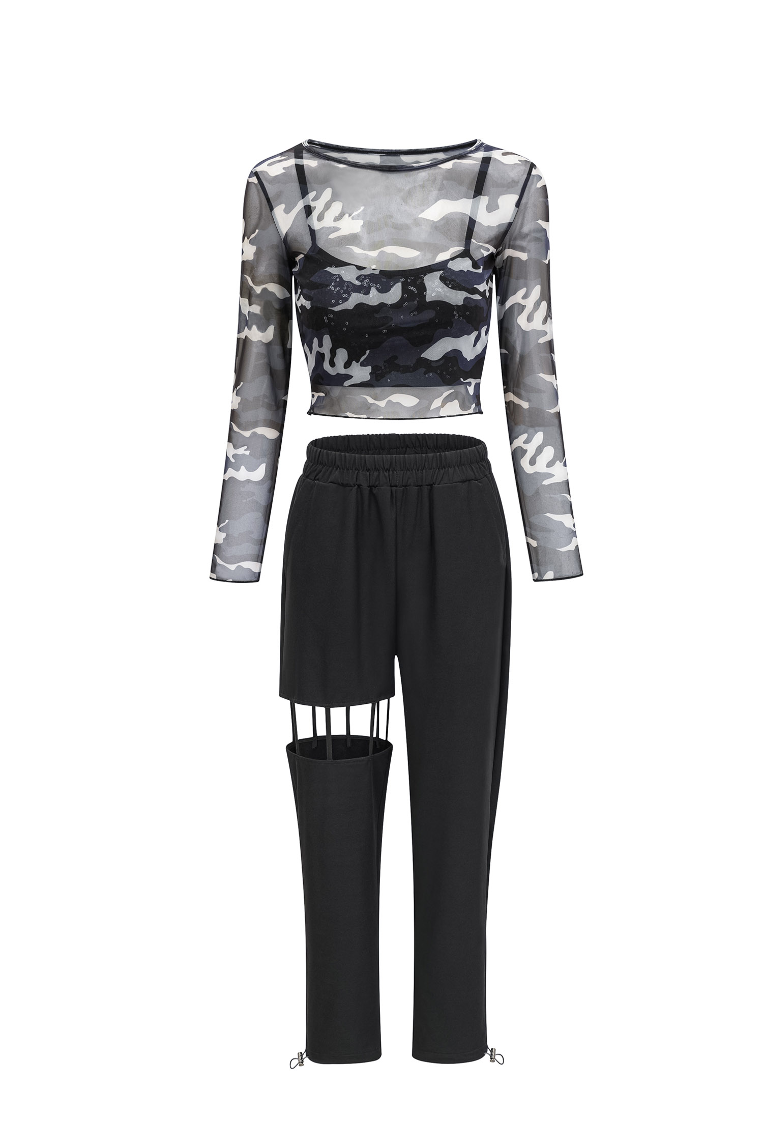 Funky urban 2 piece outfit with mock torn leg on elasticated trousers and drawstring ankles