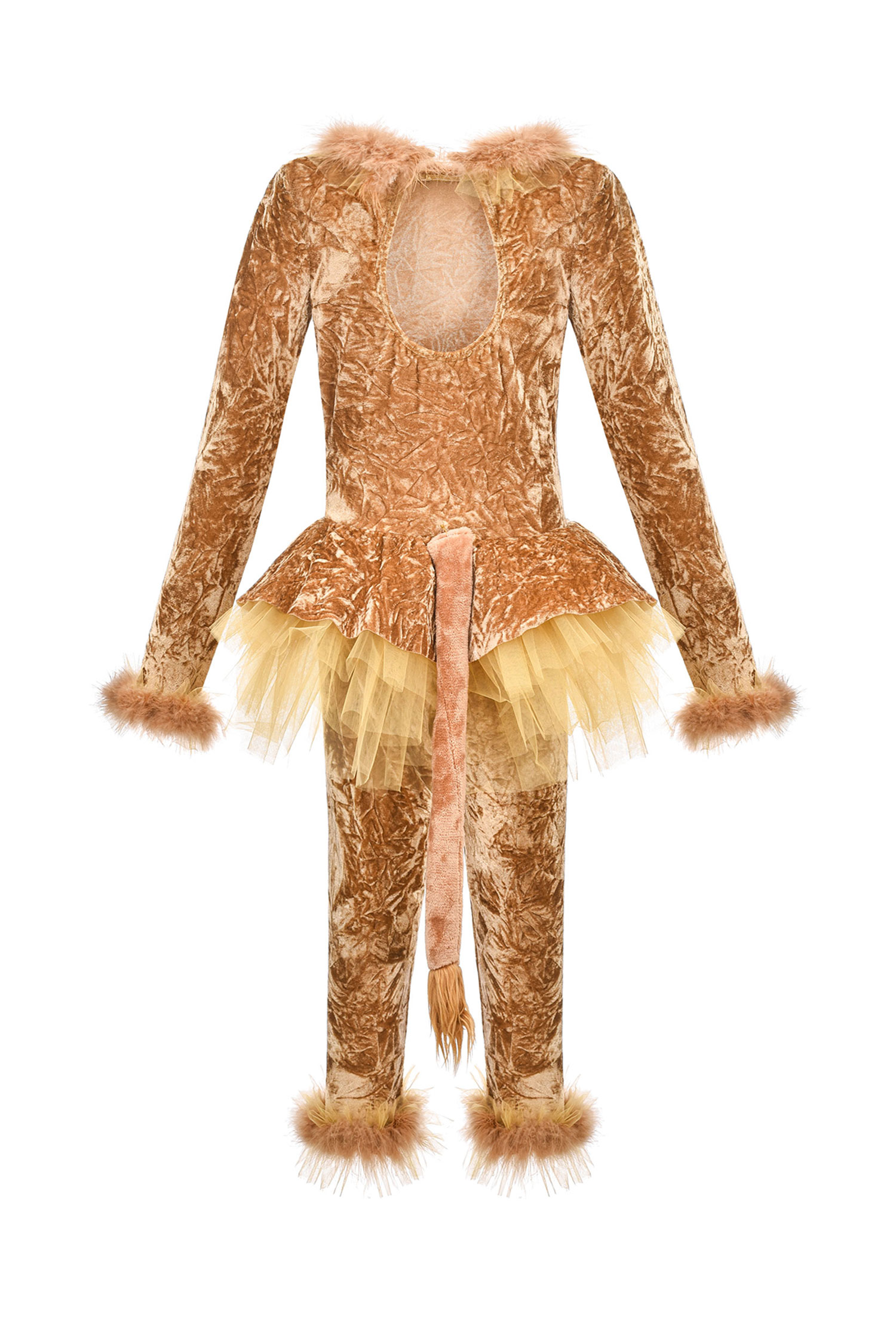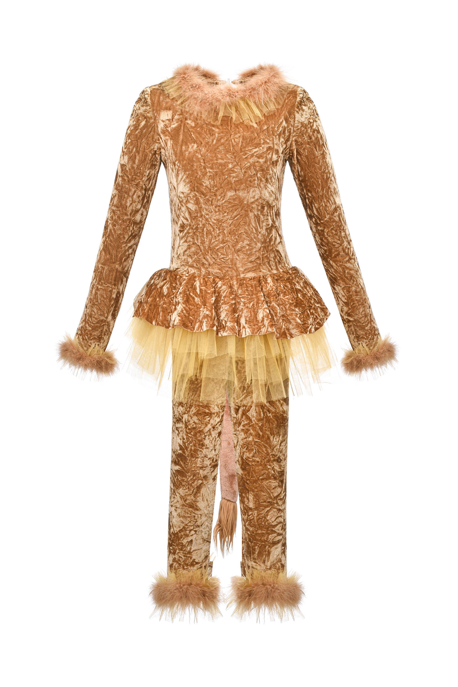 Crushed velvet costume with attached legs with net andfurcuffs to arms and legs