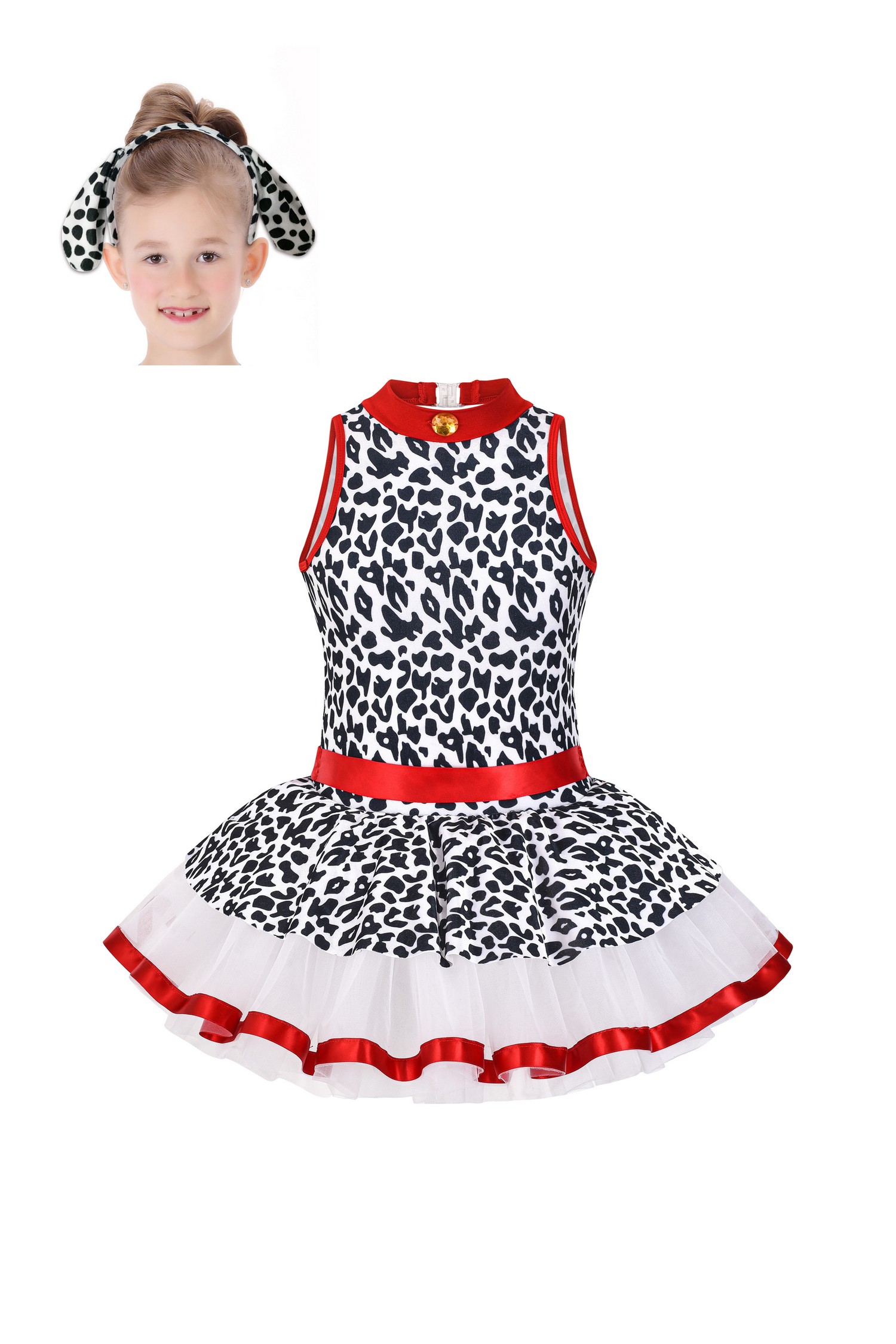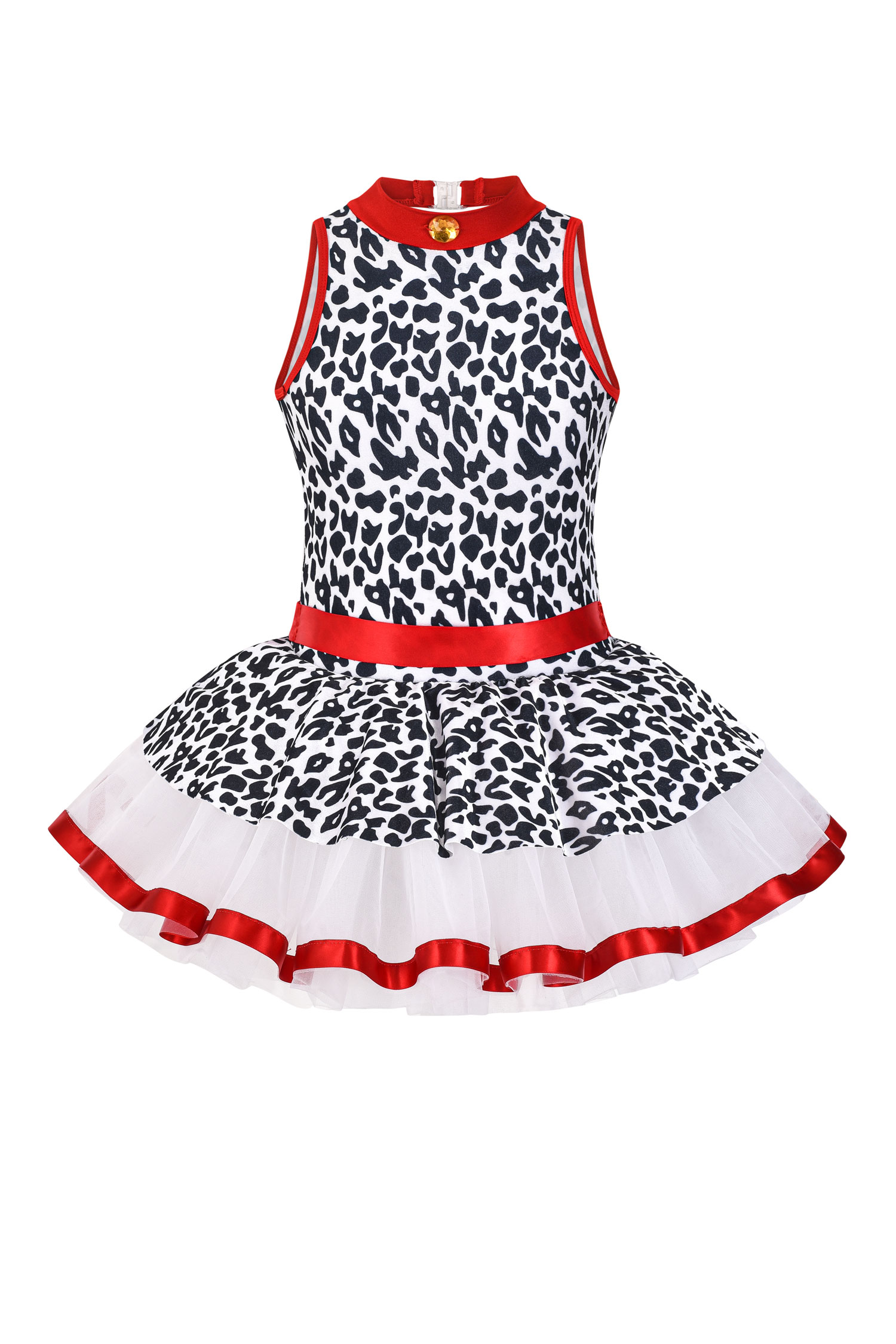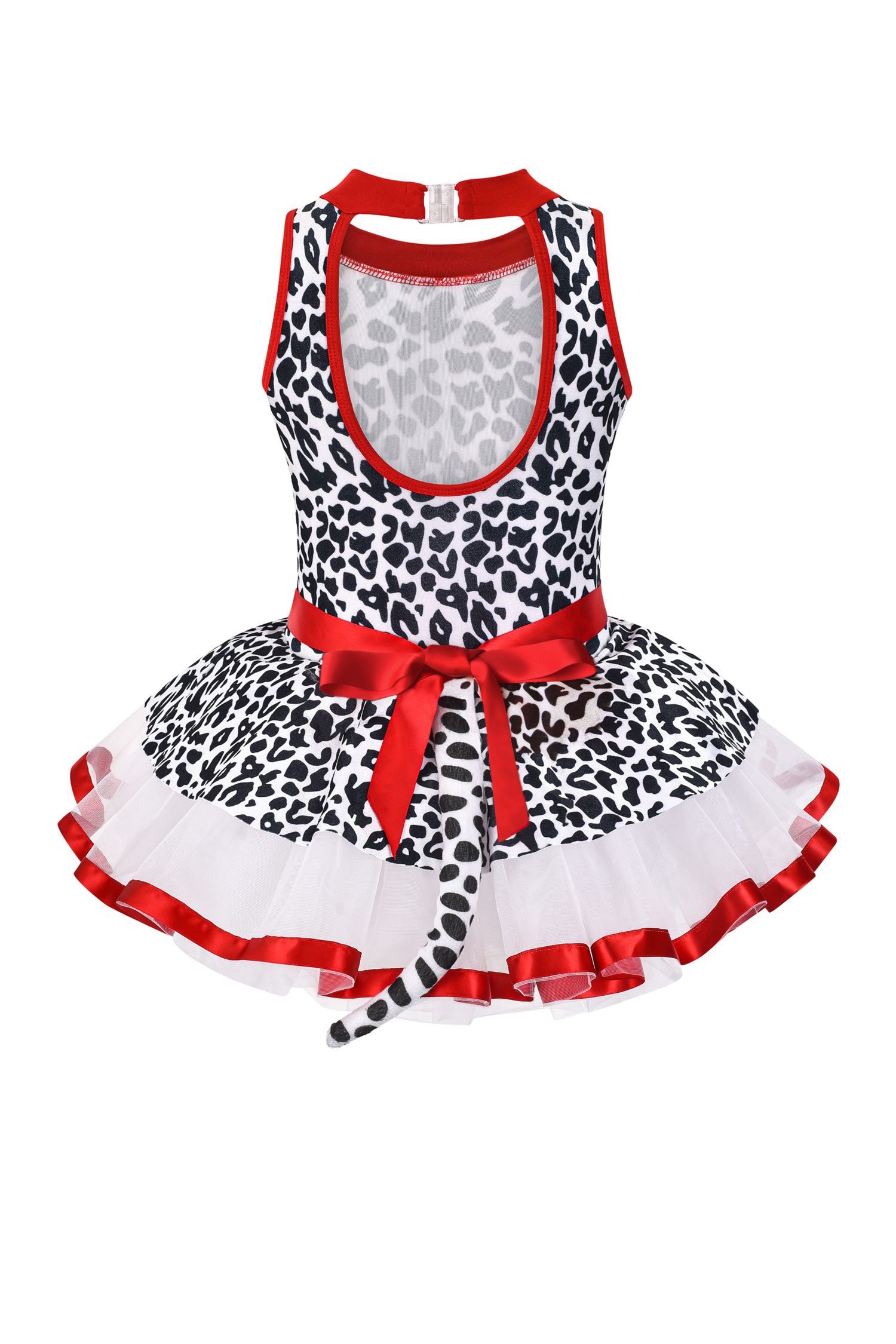 Tank-style leotard with animal print bodice and red ribbon trim
