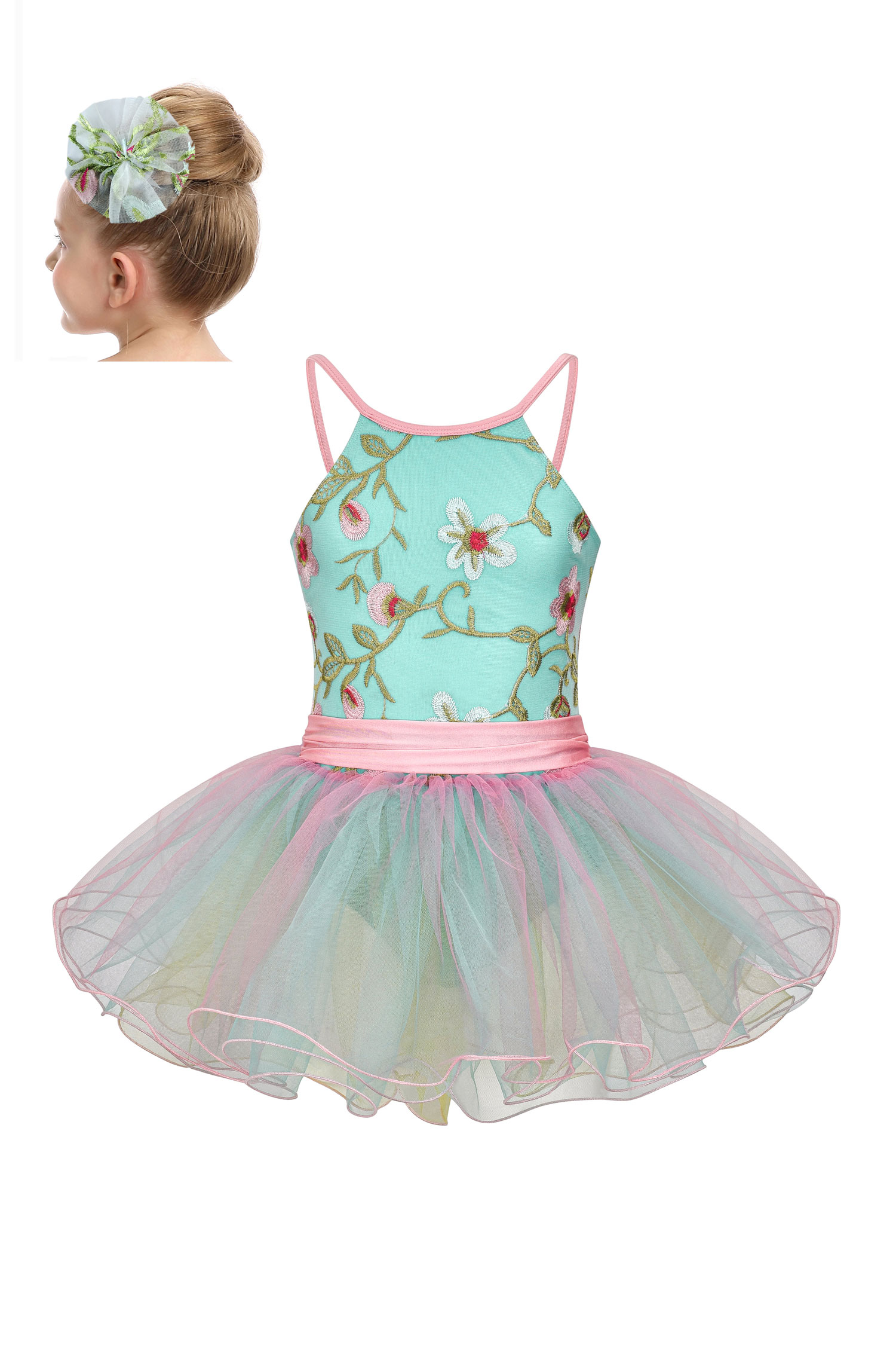 • Fresh tank style costume on a mint green leotard base with a pink spandex waistband and an embroidered climbing flower on the net overlay to the bodice and high back closure