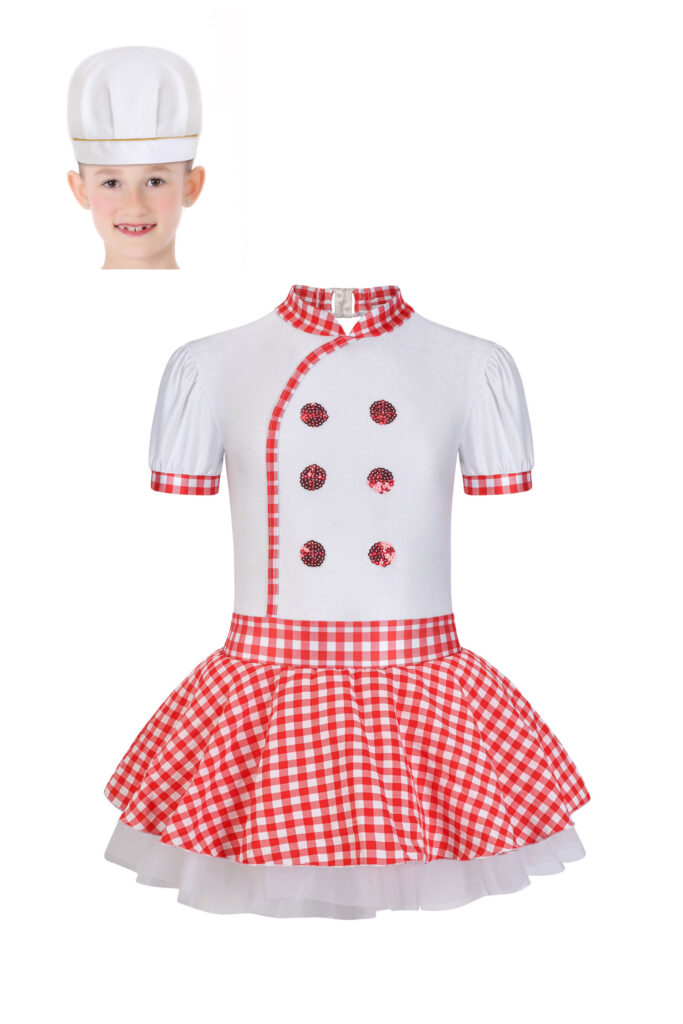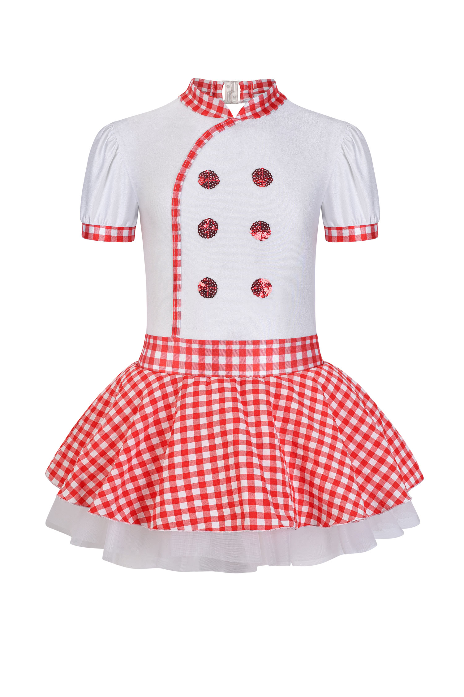 Chef costume with mock sequin buttons, gingham trim and clasp closure