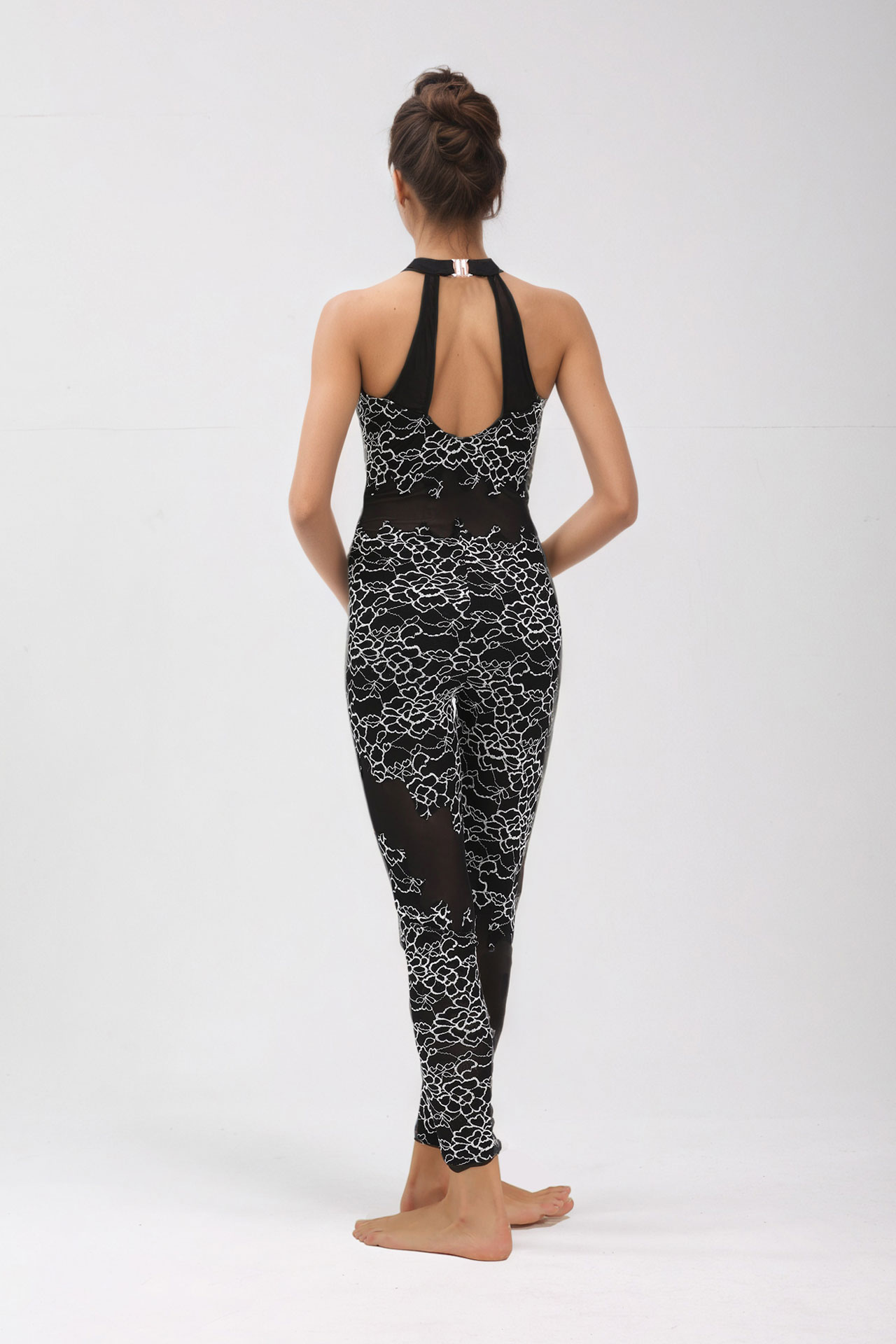 Black spandex, halter-style unitard with black and silver lace overlay and wide back straps